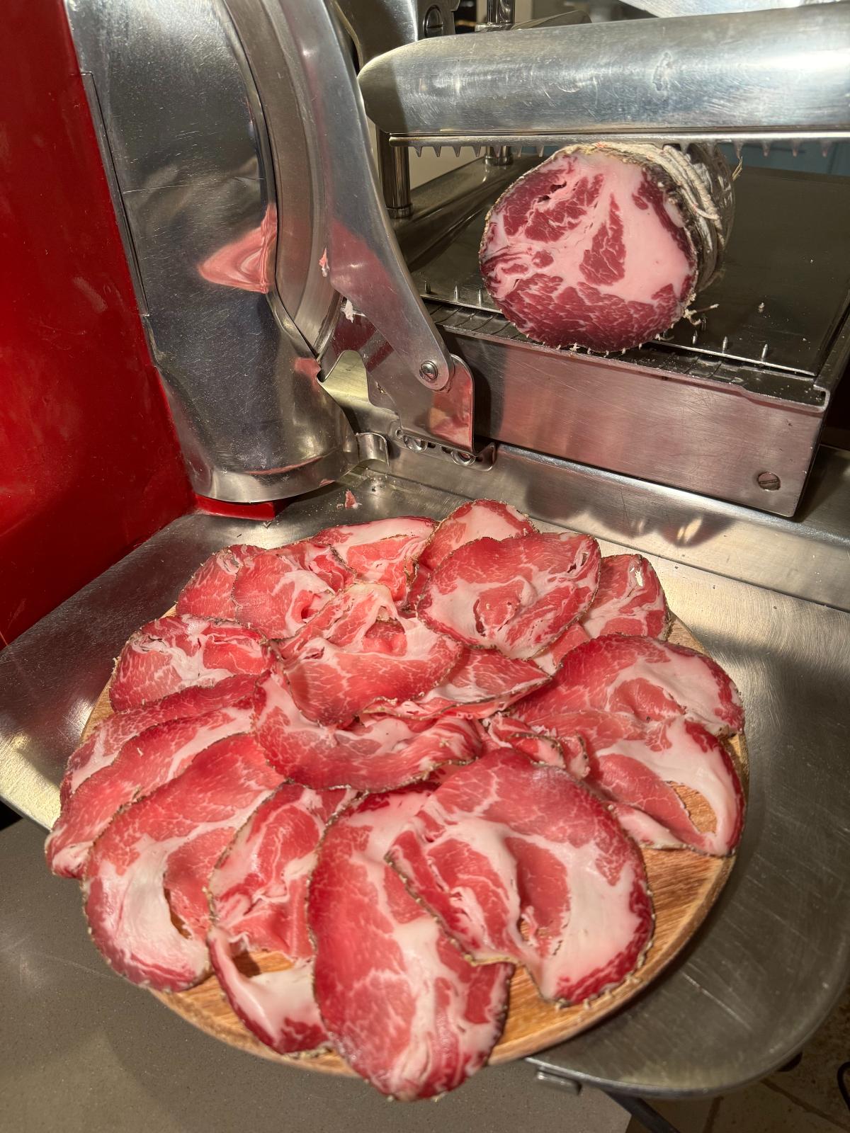 Unsere Soppressa del Grappa, Salami und Pancetta sind das Ergebnis einer sorgfältigen Auswahl der besten Fleischsorten, kombiniert mit einer meisterhaften Mischung aus Gewürzen und traditionellen Aromen der Region, die den authentischen Geschmack jedes Produkts hervorheben. Für uns ist Tradition ein Schatz, den es zu bewahren und weiterzugeben gilt. Wir folgen treu den von Generation zu Generation überlieferten Rezepten und bewahren die Geheimnisse und Handgriffe, die unsere Wurstwaren einzigartig und unnachahmlich machen. Unser Engagement besteht darin, dieses Erbe weiterzuführen und die Magie vergangener Geschmäcker lebendig zu halten. Doch unsere Verbindung zur Tradition endet nicht bei der Küche. Für uns ist der Respekt vor dem Tierwohl von grundlegender Bedeutung. Unser Fleisch stammt von lokalen Bauernhöfen, wo die Tiere in ruhigen und natürlichen Umgebungen leben, was für maximalen Komfort und ein glückliches Leben sorgt, bevor sie Teil unserer Wurstwaren werden. Wir glauben, dass ein glückliches und gesundes Tier dazu beiträgt, den Speisen einen besonderen Geschmack zu verleihen, der durch unsere Liebe und unseren Respekt für die Natur noch köstlicher wird. Mit unserem Bauernhof möchten wir mit Ihnen die Essenz unseres Landes und unserer Kultur teilen. Jeder Bissen unserer Wurstwaren ist eine Reise durch die Geschmäcker, Düfte und Emotionen einer überlieferten Tradition. Wir laden Sie ein, unsere Kreationen zu genießen, in die Schönheit des Monte Grappa einzutauchen und Teil dieses wunderbaren kulinarischen Abenteuers zu werden.
