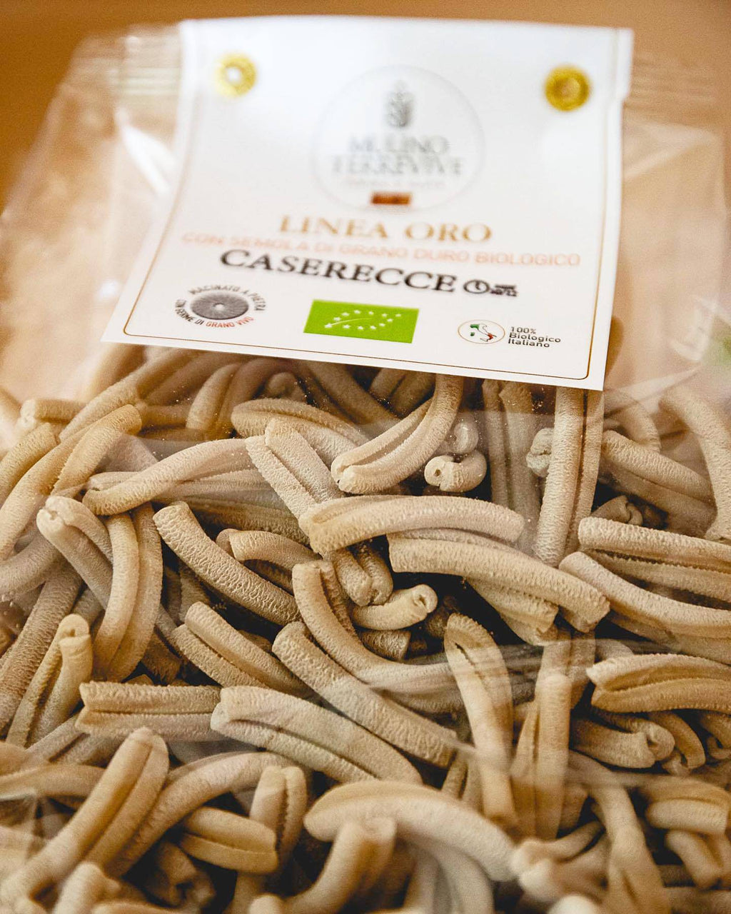 Gold wie die goldgelbe Farbe der Pasta, typisch für einen Prozess, der die ethischen Werte respektiert, die die Terrevive-Mühle auszeichnen: die Verarbeitung des Mehls in einer Steinmühle.