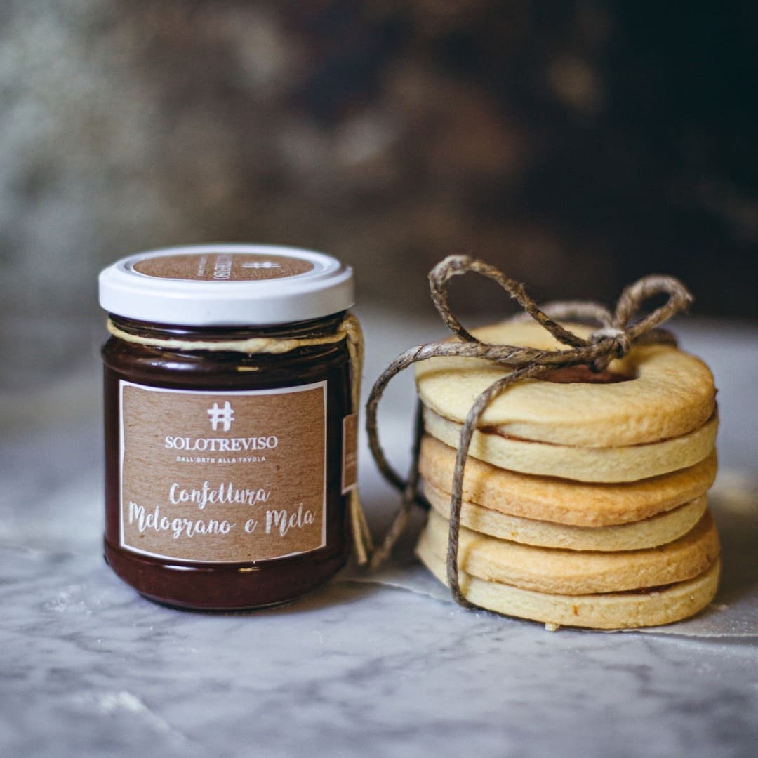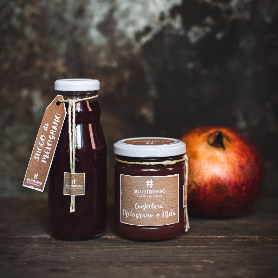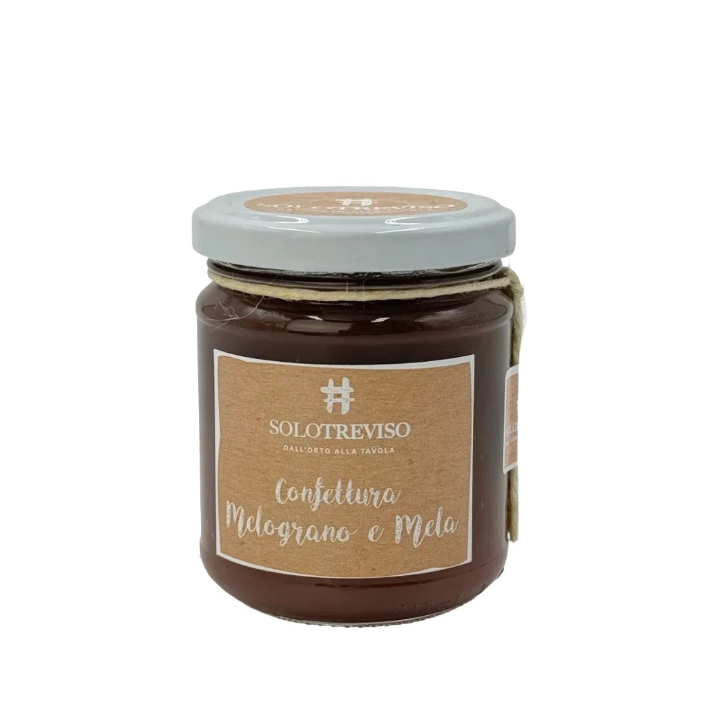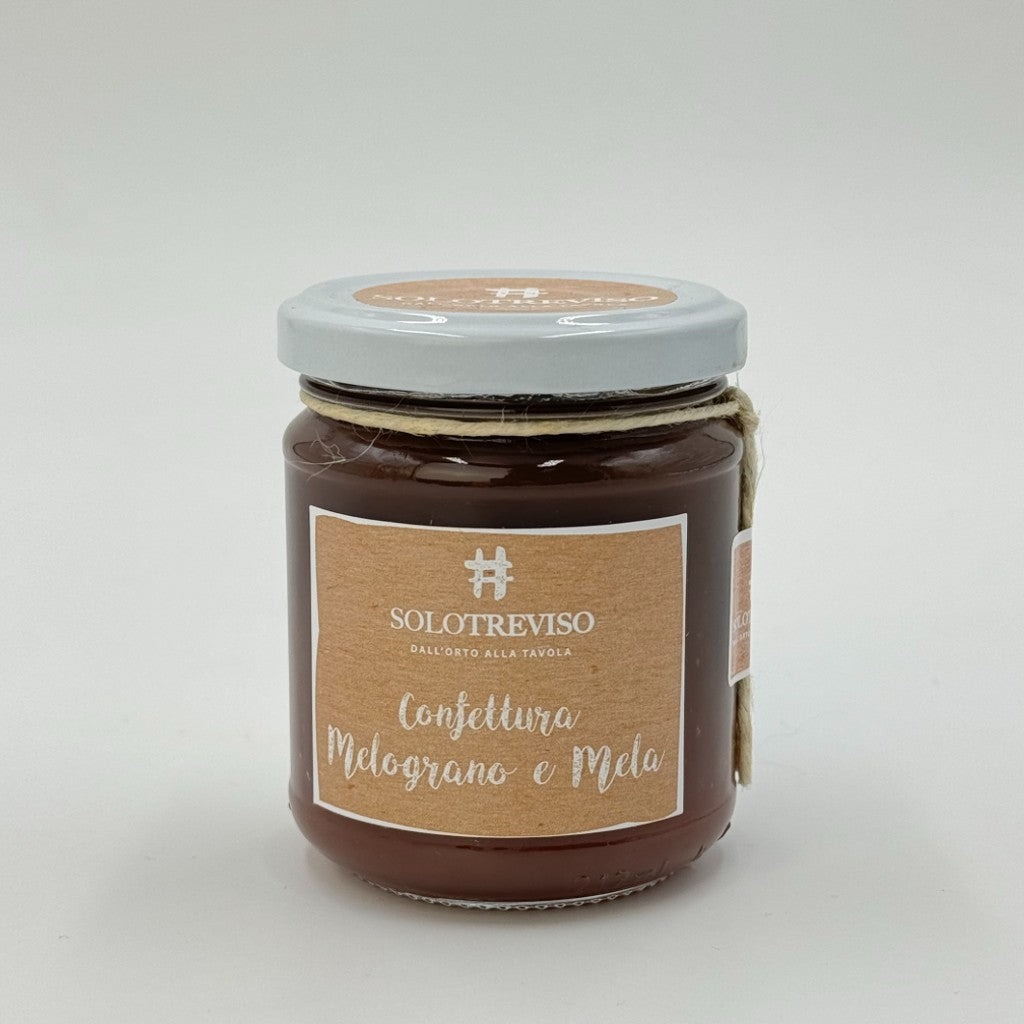 La confettura di melograno e mela di SoloTreviso cattura l'essenza dei frutti autunnali delle campagne venete, unendo il gusto dolce-acido del melograno con la naturale dolcezza della mela. Realizzata con melograno, mele, zucchero di canna e un tocco di limone, questa confettura è priva di conservanti e coloranti artificiali, garantendo un'esperienza gustativa pura e autentica. Il processo di produzione inizia con l'estrazione a freddo del succo di melograno, un metodo che preserva le sue numerose proprietà antiossidanti e il suo sapore unico. Le mele, aggiunte per la loro dolcezza naturale, funzionano anche come pectina naturale, eliminando la necessità di additivi gelificanti artificiali.